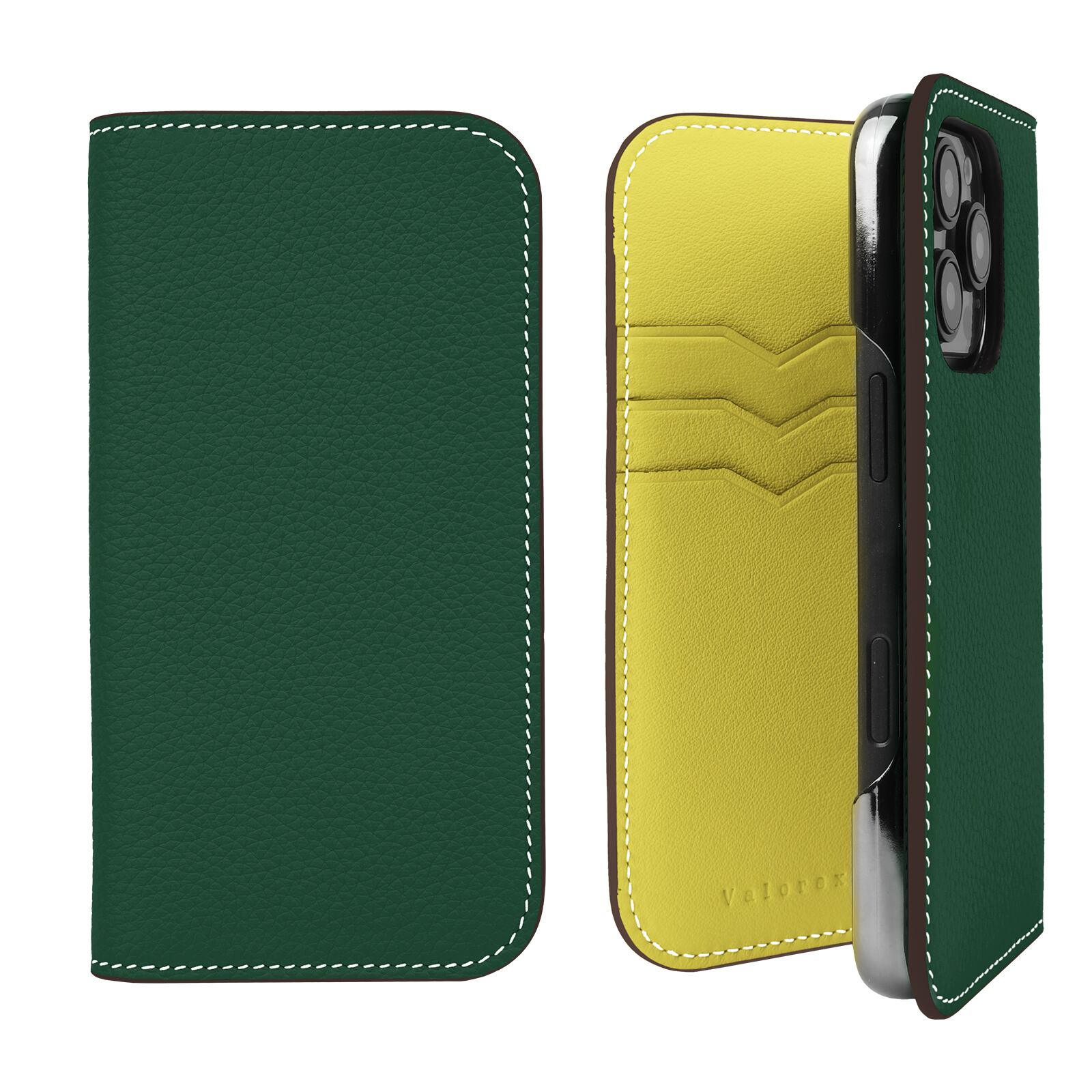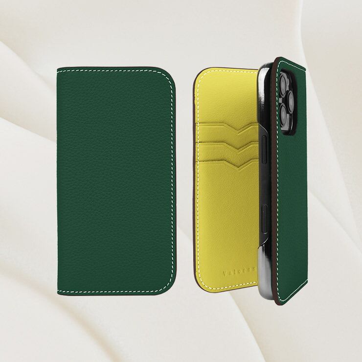 【iPhone16シリーズ】手帳型ケース トゴレザー クロムグリーン×レモンイエロー