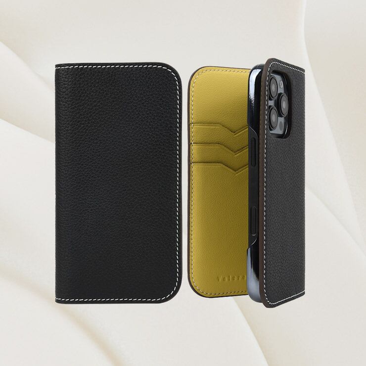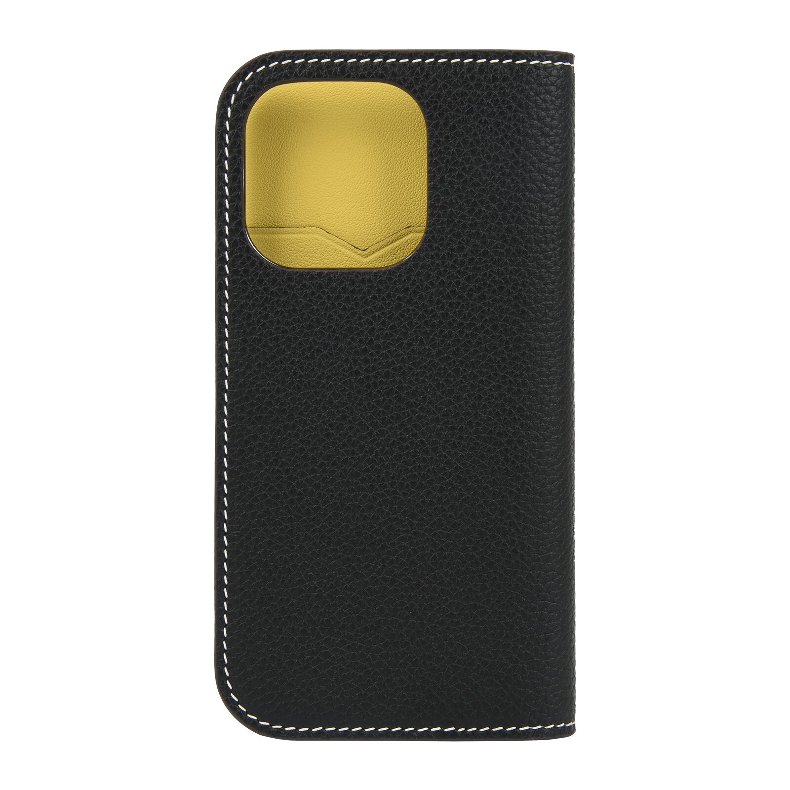 【iPhone16シリーズ】手帳型ケース トゴレザー ブラック×ライムイエロー