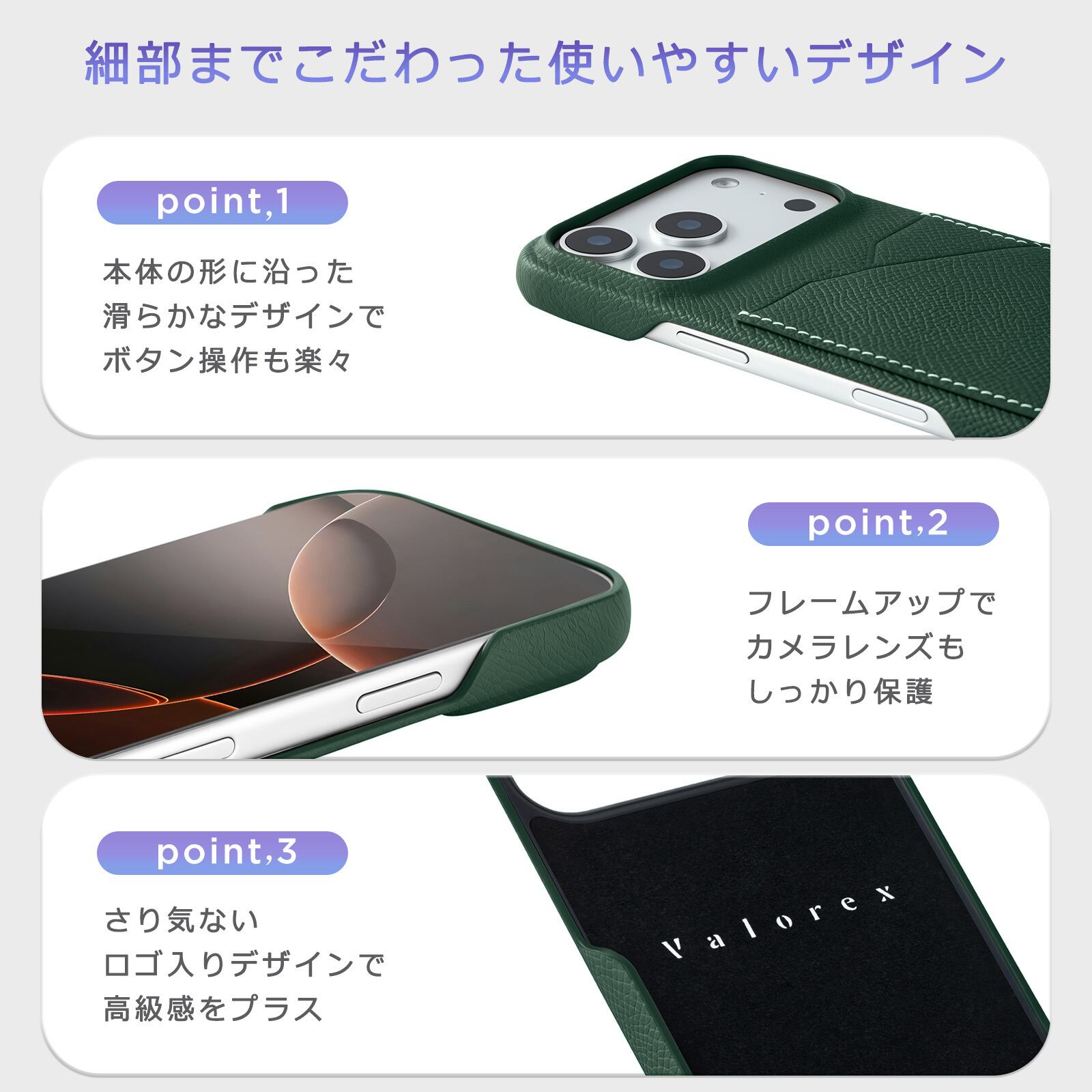 シンプルで飽きの来ないデザインや機種ごとの設計で好評を頂いております。ご使用の機種に合わせて、サイズ、カメラホールとボタンの形や位置、指紋認証などにぴったり合うようになっております。